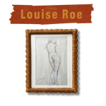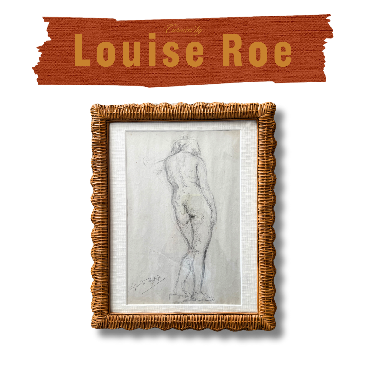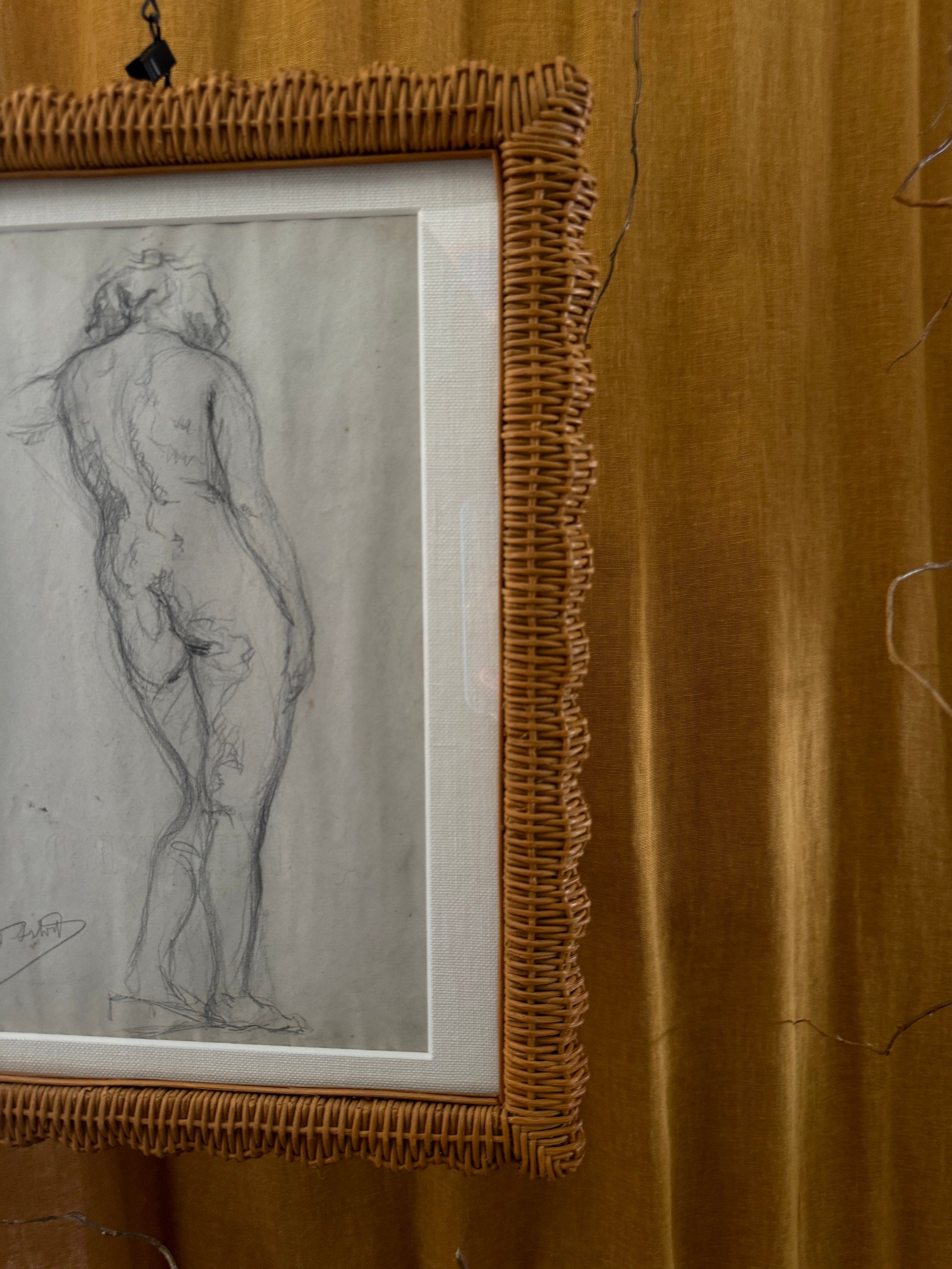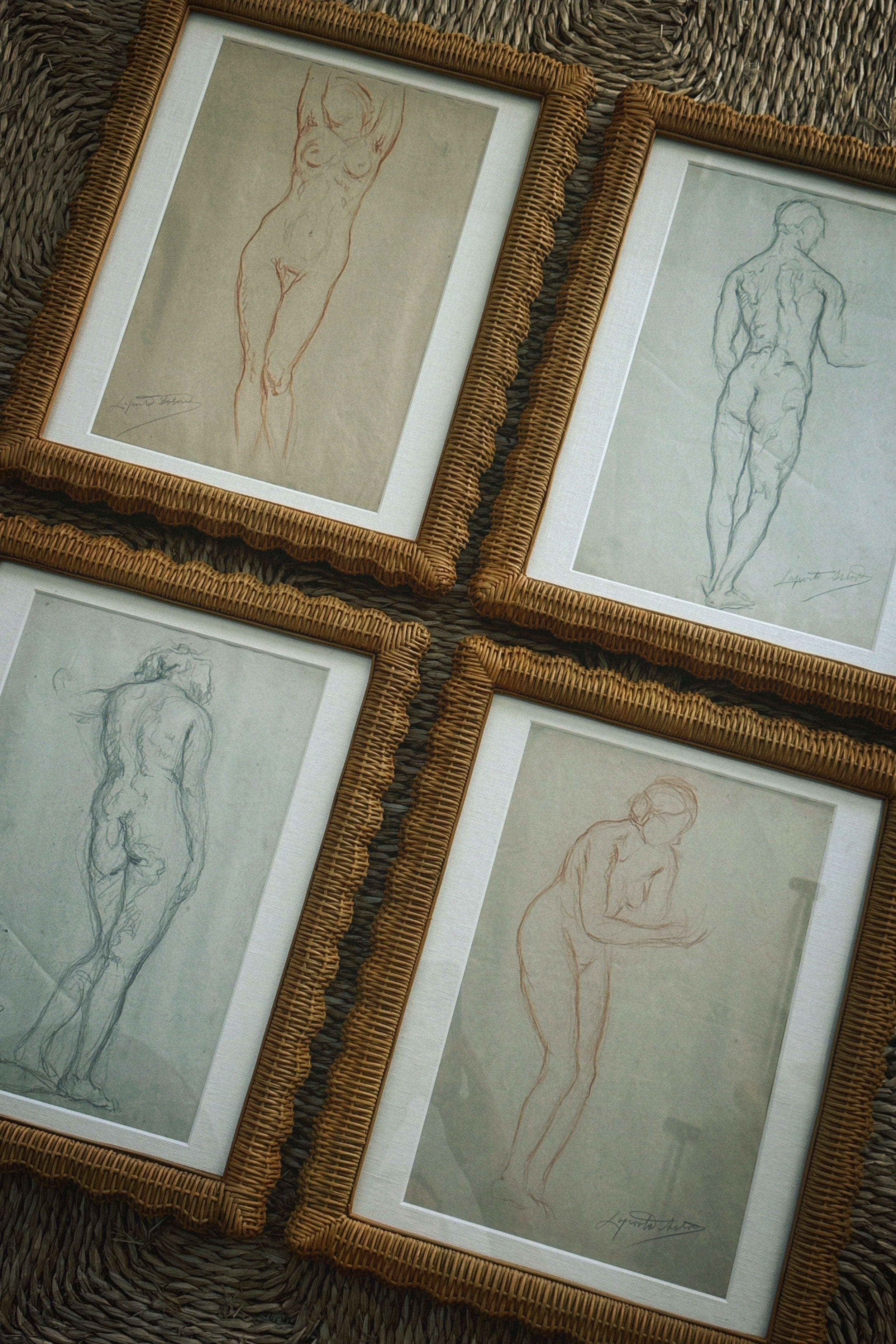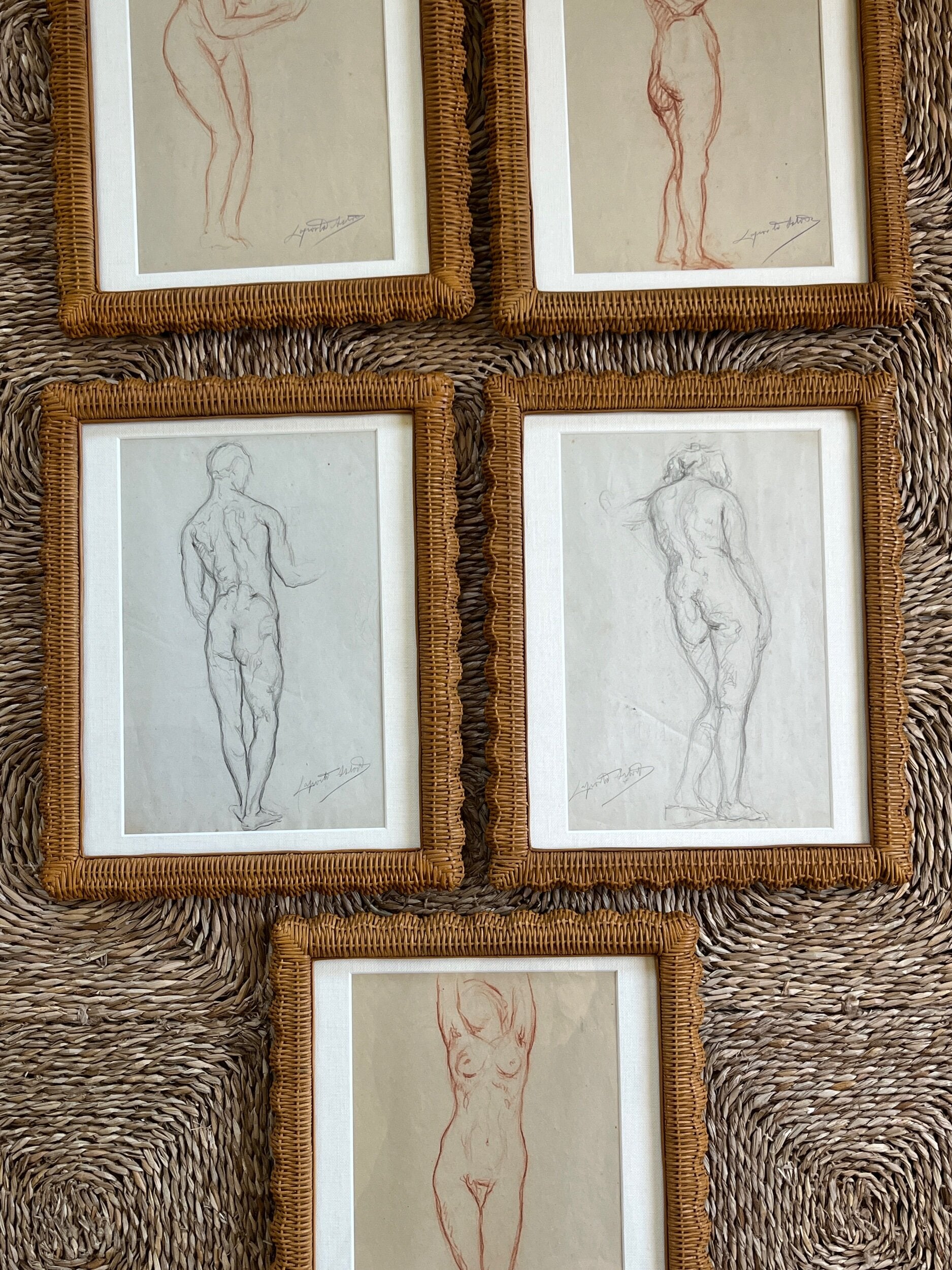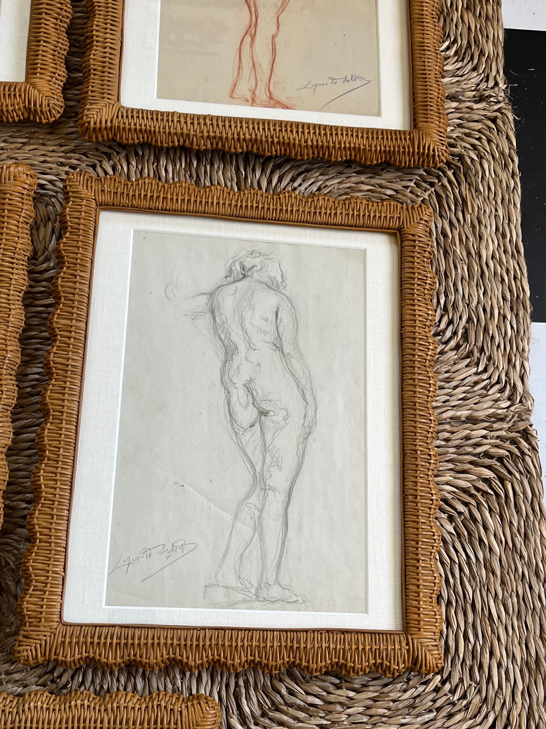 Surrounded by a rattan frame, this figure drawing from 1910 features a graceful nude depicted from behind, rendered with expressive and delicate lines in pencil. The artist captures the gentle curve of the spine and the natural contours of the back, hips, and legs. The slightly turned head suggests a moment of introspection or subtle movement, adding a dynamic element to the pose. The use of pencil or charcoal allows for soft shading that enhances the sense of depth and form.